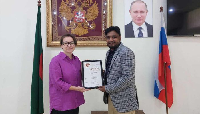 নিউজ ডেস্ক: ফটোসাংবাদিক সুমনের হাতে পুরস্কার তুলে দেন ঢাকায় রুশ দূতাবাসের চার্জ দ্য অ্যাফেয়ার্স একাতেরিনা সেমেনোভা। চট্টগ্রামের ফটোসাংবাদিক মোহাম্মদ সুমন রাশিয়ার আন্দ্রেই স্তেনিন আন্তর্জাতিক প্রেস ফটো কনটেস্টে প্রথম পুরস্কার অর্জন আরও পড়ুন