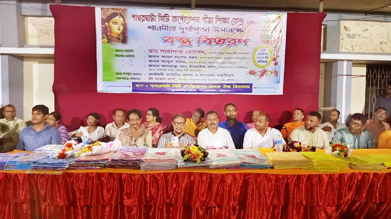 নিউজ ডেস্ক: পাথরঘাটা সিটি কর্পোরেশনের গীতা শিক্ষা কেন্দ্রের উদ্যোগে শারদীয় দুর্গোৎসব উপলক্ষে বস্ত্র বিতরণ অনুষ্ঠান অনুষ্ঠিত হয়েছে। অনুষ্ঠানে সভাপতিত্ব করেন শ্রী রয়েল দাশ। দেবব্রত দে ও বাবলু চৌধুরীর যৌথ সঞ্চালনায় আরও পড়ুন